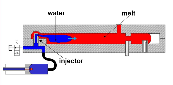 Applied to automobile engine cooling water assisted injection molding method, can realize one-piece processing, can achieve the expected one-time structure, greatly shorten the processing cycle, reduce cost and improve the quality of the product and quality than traditional steel pipes to reduce about 50% of the weight and the clamp and the tube body is in the process of a plastic injection produced at the same time, without antirust processing, low cycle time and stable quality