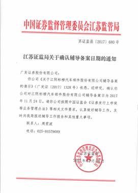 公司已收到江苏证监局关于确认辅导备案日期的通知,公司将会按照中国证监会《证券发行上市保荐业务管理办法》等相关文件要求,认真做好辅导工作,及时向江苏证监局报送辅导工作报告和其他重大事项。